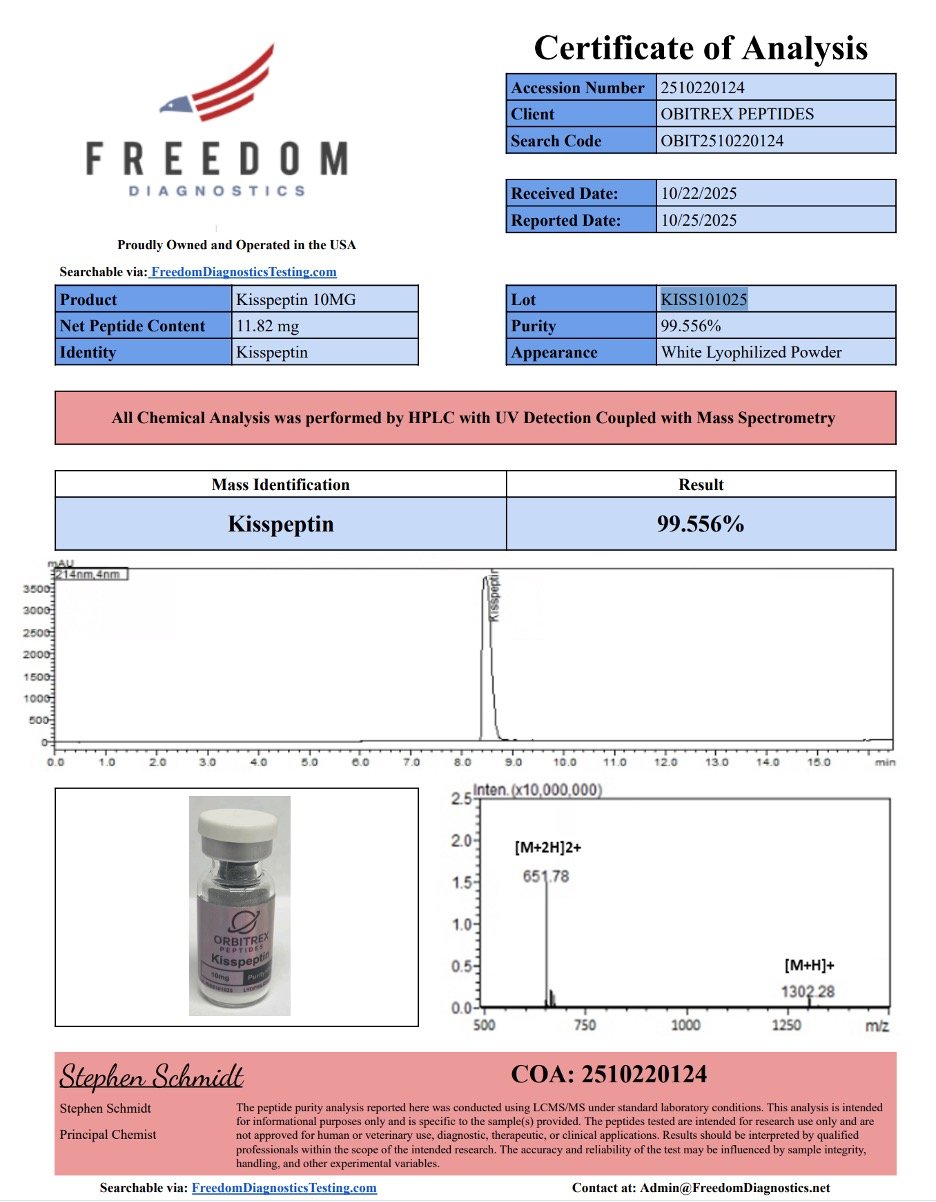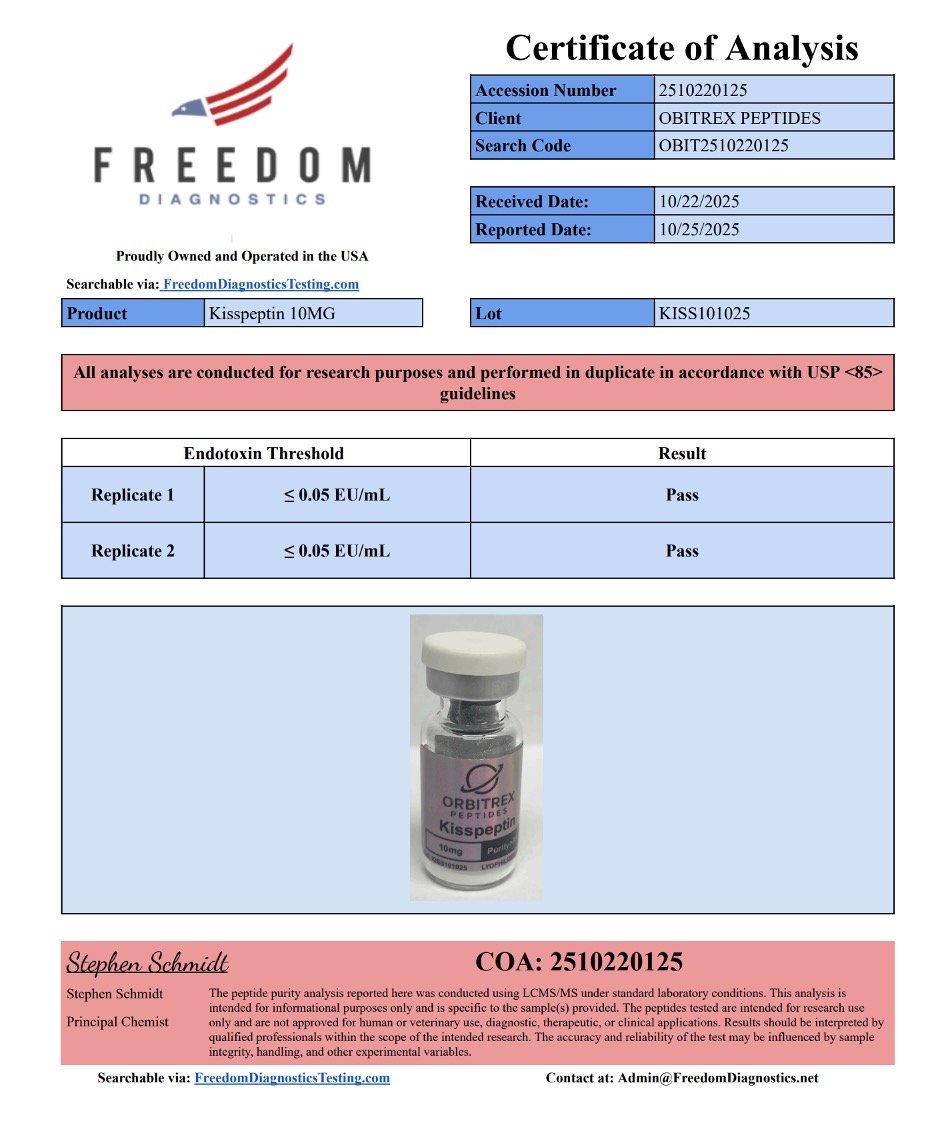 At Orbitrex Peptides, quality assurance is a top priority. Each batch of Kisspeptin 10mg undergoes rigorous testing to ensure it meets research-grade standards.