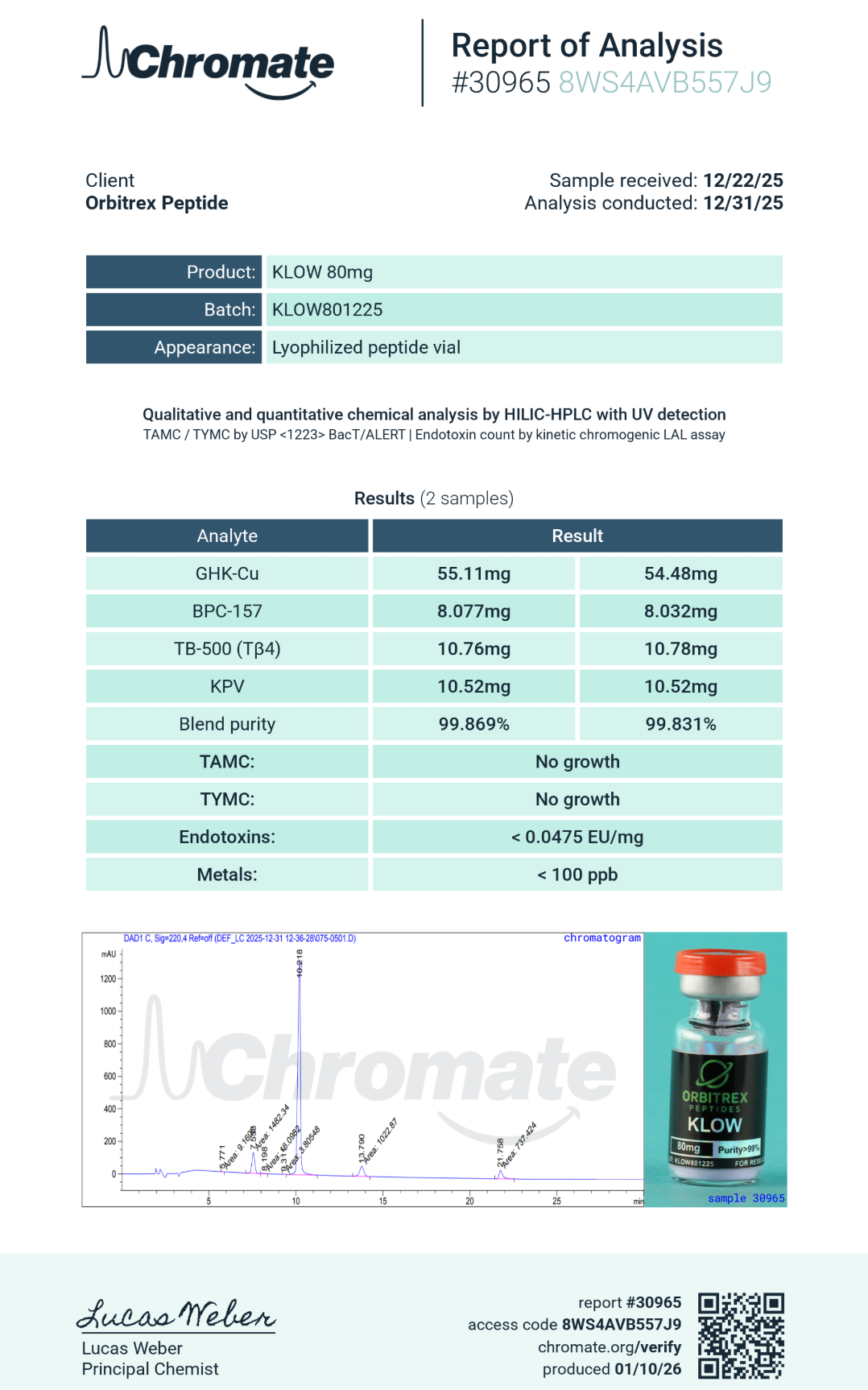 Premium KLOW products are manufactured with strict quality assurance protocols, ensuring maximum purity and consistency for research applications.