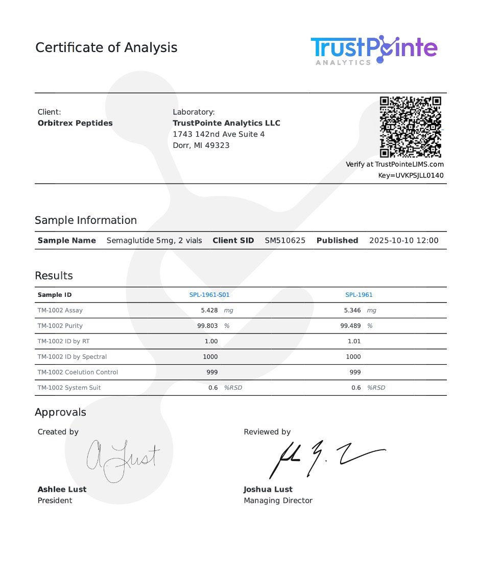 At Orbitrex Peptides, quality assurance is a top priority. Each batch of Semaglutide 5mg undergoes rigorous testing to ensure it meets research-grade standards.